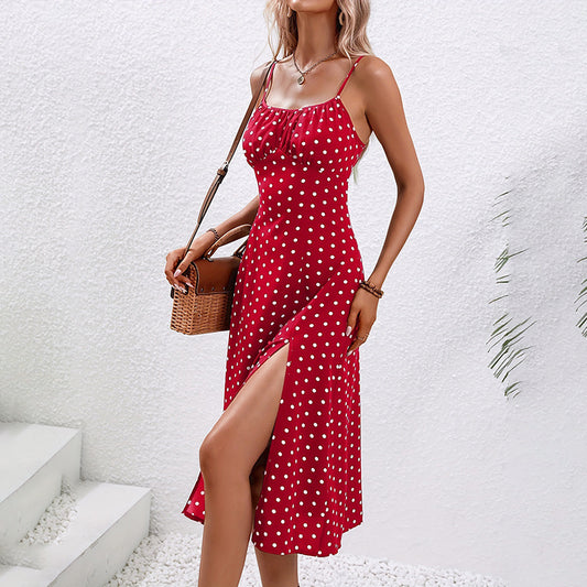 Women's Summer Casual Boho Sundress Polka Dot Sleeveless Spaghetti Strap Backless Side Slit Dresses